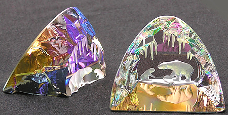 This Lovely Standing Crystal Decoration will perch on a clock, mantel, table, desk, windowsill, or special shelf ~ Any surface that begs for something gorgeous! Colors constantly change with the light and viewing angles. Exquisitely detailed figures of a mother Polar Bear and her Cub in an Ice Cave are carved into the back of the crystal. They are seen both in the face of the crystal and reflected in the base. The frosty carved icicles glow with lovely rainbow colors. Magical Iridis crystal color scheme shimmers with a full range of bright colors.